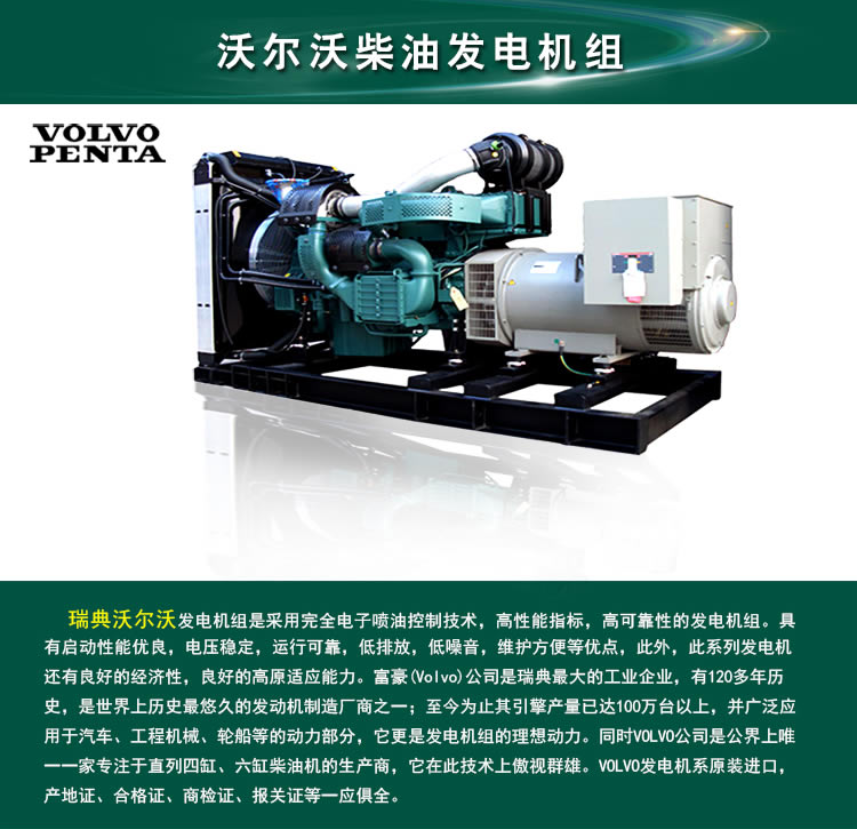 沃尔沃,英文名为Volvo,瑞典著名品牌,又译为富豪,沃尔沃VOLVO系列环保型机组,排放达到欧盟二号或三号及EPA环保标准,发动机选用久负盛名的瑞典沃尔沃集团生产的电子喷射柴油发动机,沃尔沃始创于1927年,创始人是古斯塔夫·拉尔松和阿萨尔·加布里尔松。长期以来,它闪亮的品牌一直与它的三个核心价值观——质量、安全、环保紧密相联系在一起,集团属下的VOLVO PENTA专注于发电、专用车辆及船用柴油发动机的生产,它在六缸发动机及电子喷射等方面技术实力雄厚。