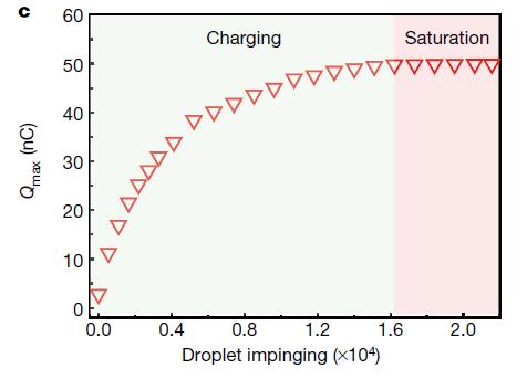 纵坐标为随着水滴不断落下,PTFE膜中逐渐积累的电荷量(nC),横坐标为水滴落下的数量(万滴)。在大约16000滴时,PTFE膜中的电荷量达到了饱和。(图片来源:Xu et al。, 2020)
