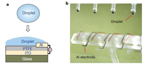 水滴发电机结构示意图(a)与实物图(b)。(图片来源:Xu et al。, 2020)